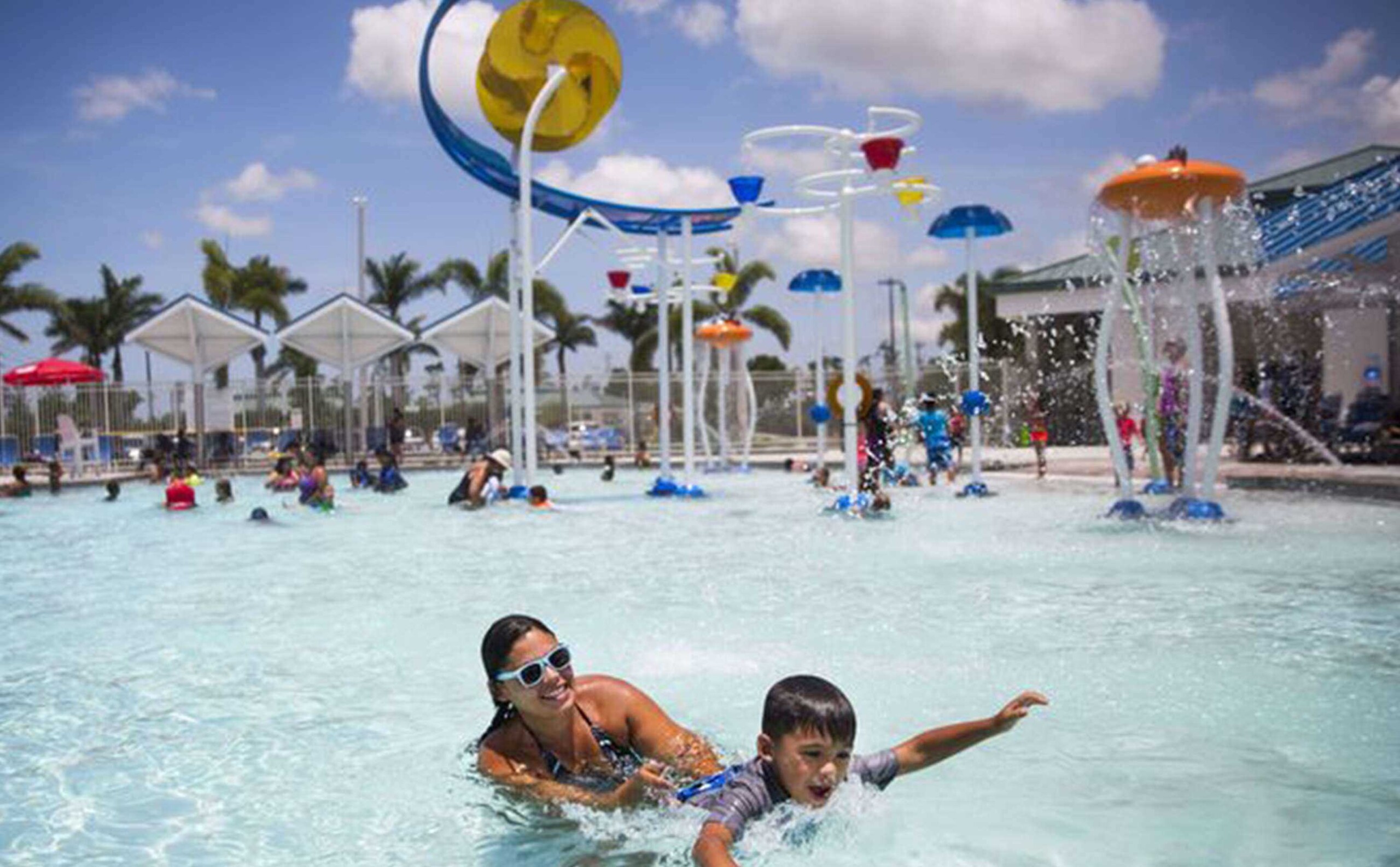 Facilities include: Interactive water features such as water dumping buckets, water pistols, 4 pools including a family pool, Tadpole pool for children 6 and under, Turtle Cove for kids 5 to 12, a lap/diving pool, and a lazy river with 5 water slides called Sunny’s River.